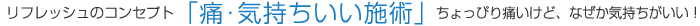リフレッシュのモットーとして、ただ痛みをとるだけの施術法ではなく、なぜそうなったのかもご説明いたします。また、今後の日常生活においてどのような点に注意していただきたいか、という 「改善法」 までもしっかりとご指導致しております。